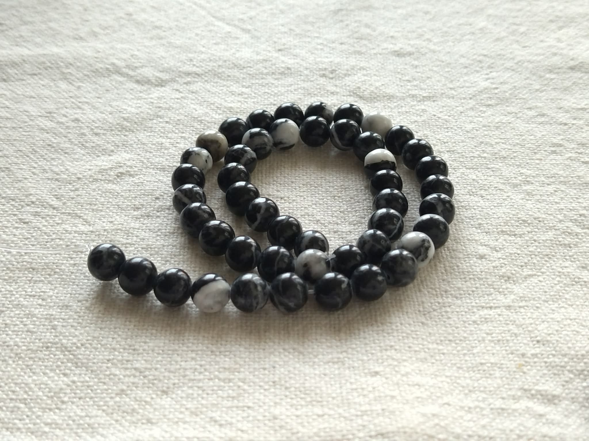 Ez az zebra márvány ásványgyöngy kiváló minőségű alapanyag ékszerkészítéshez. Természetes megjelenése és egységes kidolgozása miatt ideális karkötők, nyakláncok és egyedi kézműves ékszerek készítéséhez.
